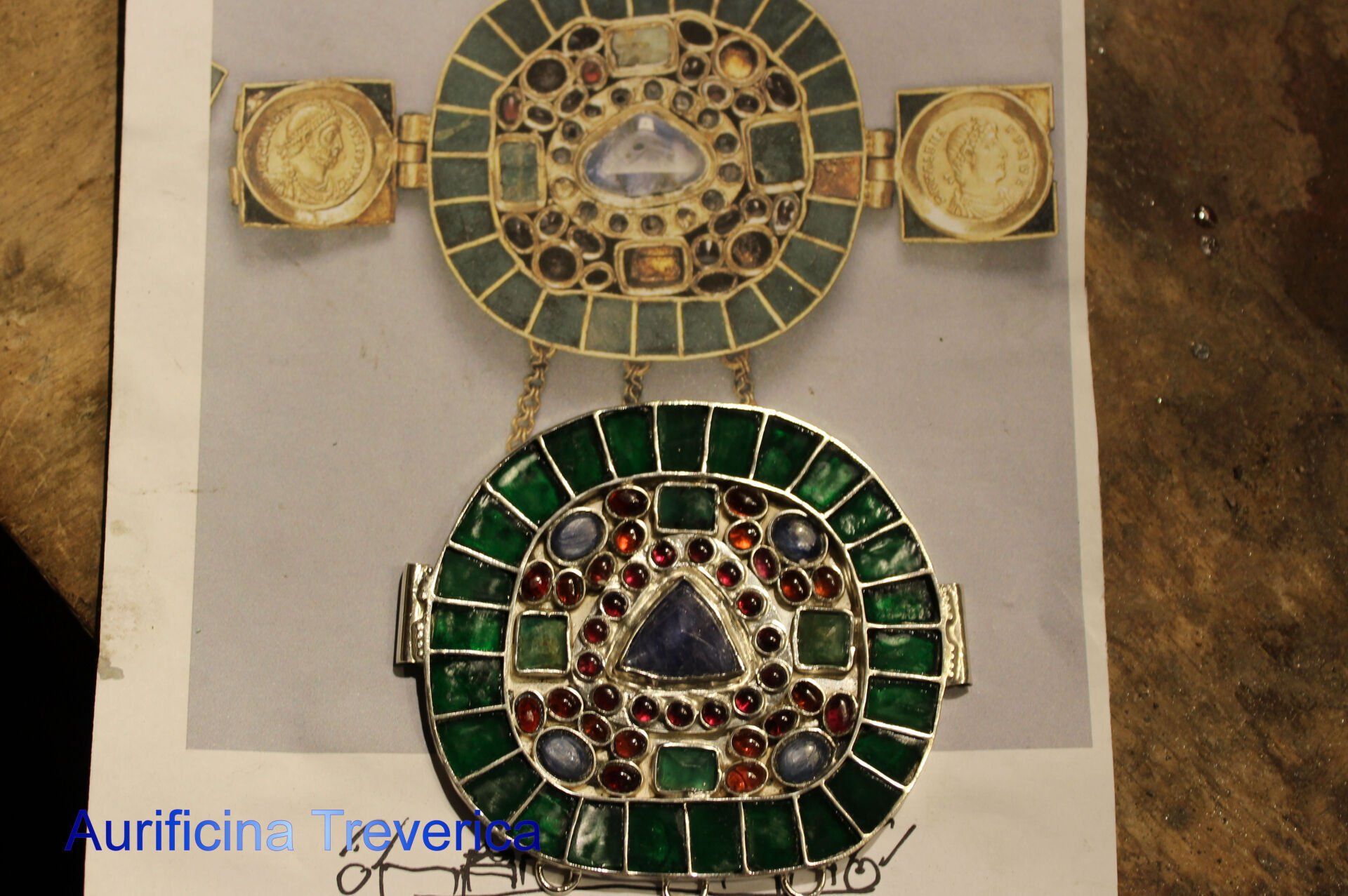 Einer der bedeutendsten Gürtel der Spätantike befindet sich in der Paul Getty Villa in Malibu und datiert 379 bis 395 AD aufgrund der jüngsten Münze des Kaisers Theodosius 1. Er bestand aus einer Juwelen besetzten Mittelplatte mit Saphir, Smaragden und Granaten, umringt von 23 Fassungen mit Münzen verschiedenster Kaiser von Constans bis Theodosius I. Hauptfarbe grün durch grüne Glaspaste. Die Münzprägungen sprechen für eine Produktionen in den Ostgebieten des Reiches. Um dies wunderbare Original zu rekonstruieren, verwendete ich Silberblech, aus dem ich die einzelnen Fassungen und Scharniere lötete und montierte. Als Glaspaste verwendete ich grüne Glasplatten von ca. 2mm Stärke ,die ich für jedes Kompartiment passend schleifen mußte, so auch für die dreieckigen Zwickel in den Münzfassungen (92 Stück) . Um den großen Saphircabochon zu ersetzen, verwendete ich einen großen Iolith, auch Wassersaphir genannt. Ich entschloß mich, die ovalen leeren Fassungen mit blauen Steinen , Kyaniten, zu rekonstruieren, da Smaragde in der Antike stest rechteckig vorkommen, entsprechend ihrer rhombischen Naturform. Nur im Hellenismus verstand man sich auf das Umschleifen von Smaragden. Ovale Fassungen konnten auch nicht für Perlen sprechen, die stets auf Draht gefädelt in Fassungen verwendet wurden. Weitere Granate hätten optisch auch keinen Sinn gemacht. Nach dem Verlöten und überarbeiten der einzelnen Fassungen, mußten alle Steine und Glassteine gefaßt werden. Nach weiterem Überarbeiten konnte das Stück goldplattiert werden. Aufgrund der Länge des Originals ist es nicht sicher, ob dieser Gürtel von einem Mann oder einer Frau getragen wurde. Spätantike Mosaike, z.B. Piazza Amerina, zeigen die Verwendung von großen ovalen Gürtelschließen bei Frauen , getragen auf Colobium oder Dalmatika. Die frühesten Belege von Münzen in Verwendung als Schmuckbestandteil datieren um 200 n.Chr. Aufgrund der Sortierung der verschiedensten Kaisermümnzen gehe ich hierbei nicht von einem Machtsymbol aus. Das Photo oben zeigt den Gürtel getragen auf einem gewebten Gürtel, um die Seidentunika zu schützen. Diese wurde nach einem Grabfund des Paulinus Sarkophags Trier nachgerabeitet in zweifarbiger Seide mit Kreuzmotiven.